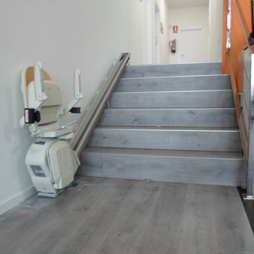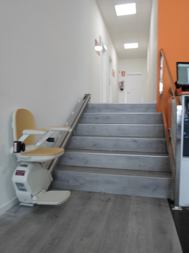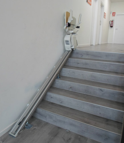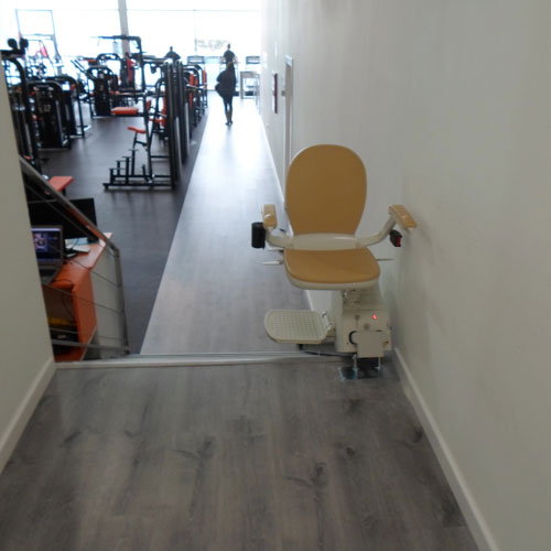 Esta silla salva una escalera recta de seis peldaños que dan acceso al interior del gimnasio, dando una solución accesible para los usuarios con movilidad reducida. Puedan realizar su deporte favorito con plena autonomía.