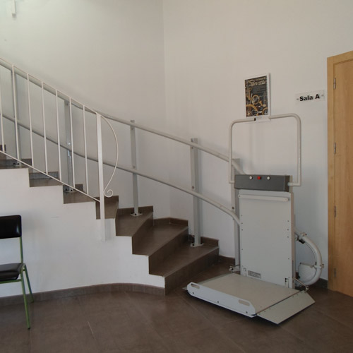 En este edificio oficial necesitaban cumplir la normativa de accesibilidad a lugares públicos y nosotros les hemos ofrecido una plataforma Slim en un tramo curvo de escalera conectando el primer piso con la planta baja para los desplazamientos con silla de ruedas. Su instalación es fácil y rápida fijándose con pies de apoyo a los escalones y sin necesidad de obras ni cambios estructurales, puede estar montada en poco tiempo.