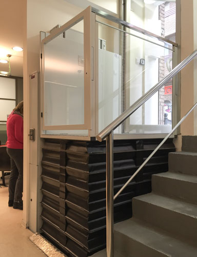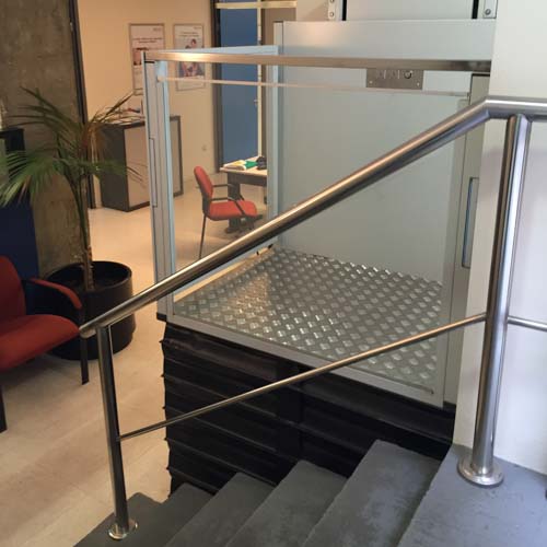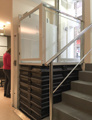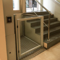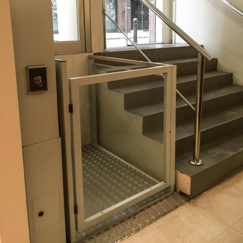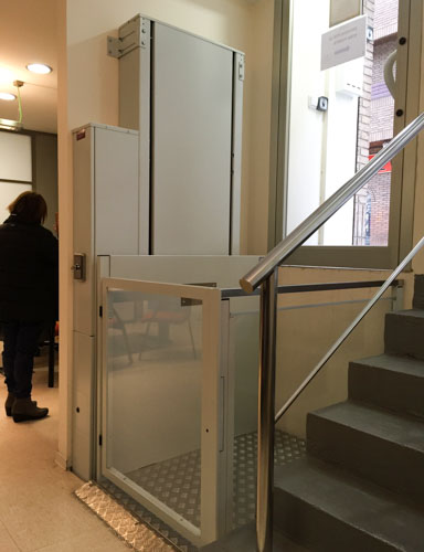 Esta plataforma se ha instalado en unas oficinas públicas para salvar un tramo recto de escalera. Su elevación es vertical y puede subir hasta 2 metros de altura.