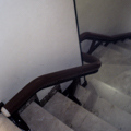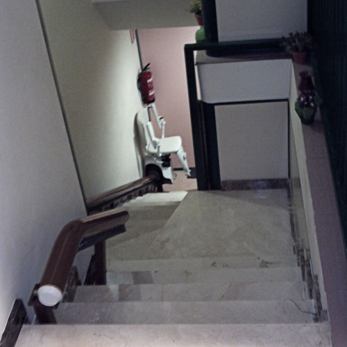 Hemos instalado silla Flow2 en este domicilio por sus características especiales, esta silla se puede instalar en casi todo tipo de escaleras porque es capaz de recorrer escaleras curvas, cambios de pendientes y la silla ocupa el menor espacio posible ya que su asiento y reposapiés se pliegan cuando está en reposo.
