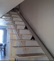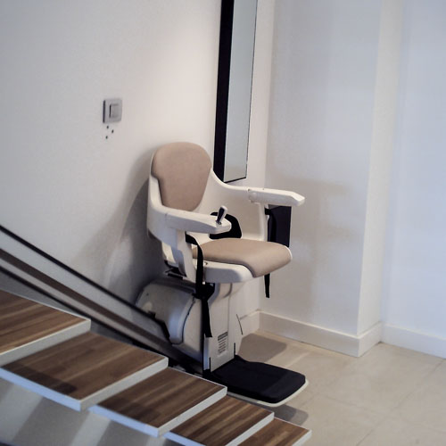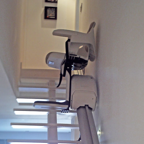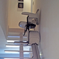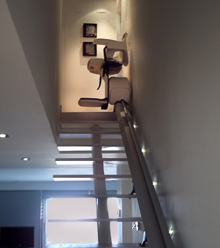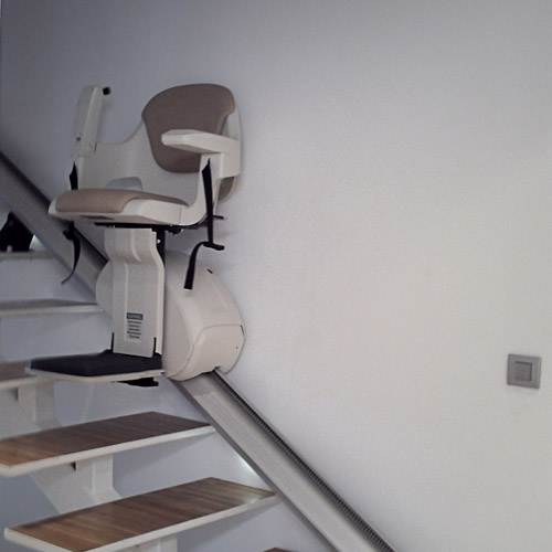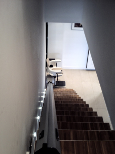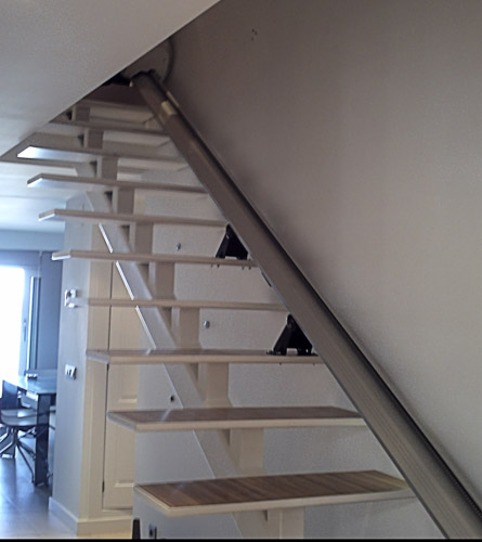 Esta silla salva un tramo recto de escalera instalada en el lado interno de la escalera sobre una escalera volada. Gracias a su aire contemporáneo se integra totalmente a la estítica de la casa pasando totalmente desapercibida.