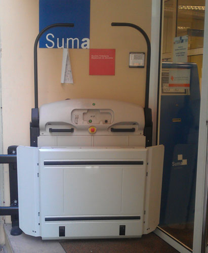 En esta ocasión la plataforma tiene que superar un pequeño desnivel de un escalón, pero hace que los usuarios que se desplazan con silla de ruedas no puedan acceder a estas oficinas.