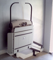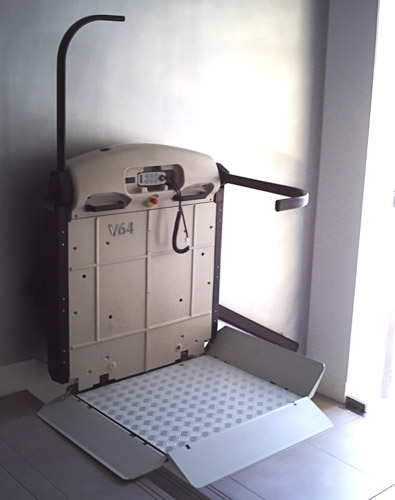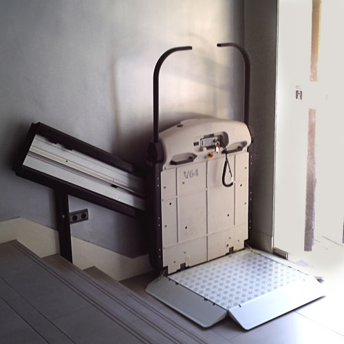 Esta plataforma se ha instalada en la entrada de un edificio multiplanta, para salvar los pocos escalones que conectan el nivel de la calle con el acceso al ascensor. Estos escalones ocasionan dificultades a los vecinos con silla de ruedas que no pueden acceder a sus hogares de forma autónoma. Por eso la mejor opción es la V64, puede llevar a los usuarios con silla de ruedas de una manera fácil y segura y cuando está en reposo se pliega y ocupa poco espacio para no interrumpir el paso al resto de vecinos.