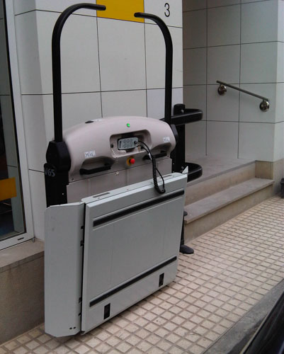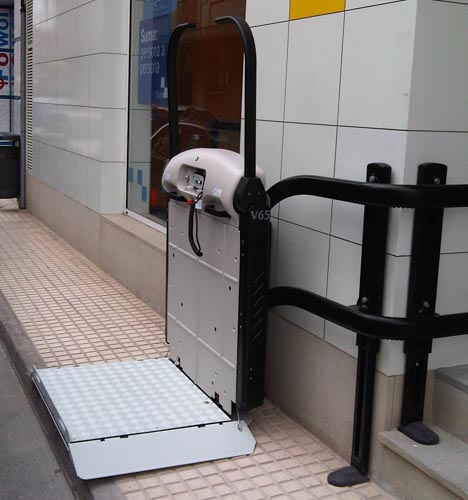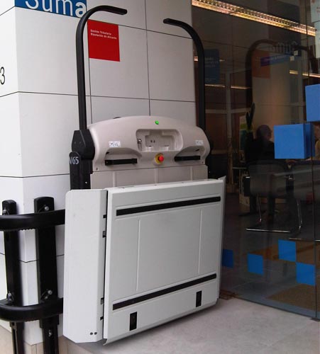 La plataforma Vimec V65 salva un pequeño desnivel de dos escalones, enlazado el nivel de la calle con el de la oficina, su recorrido es recto pero en el aparcamiento se ha realizado una curva para no interrumpir el paso de los viandantes.