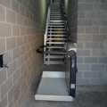 La plataforma transporta al usuario con silla de ruedas desde la planta baja hasta el primer piso por una escalera recta con cambio de pendiente. Está ubicada a mano derecha para dejar libre el pasamanos. Este tipo de plataformas se pueden instalar en cualquier tipo de escalera sin ningún problema. En este caso, tenemos una escalera de metal anclándose con pies de apoyo a la estructura de la guía.