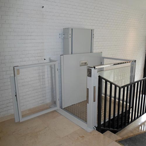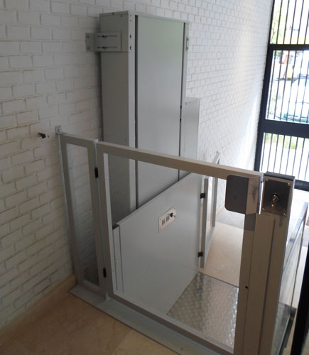 En este caso hemos tenido que hacer una pequeña obra. Debido a su gran entrada hemos recortado parte de la escalera para instalar esta plataforma, que salva de forma vertical un tramo recto de escalera.