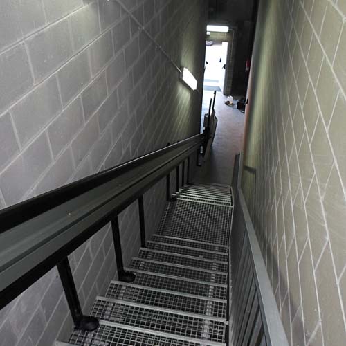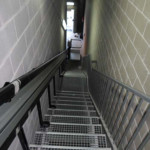 La plataforma transporta al usuario con silla de ruedas desde la planta baja hasta el primer piso por una escalera recta con cambio de pendiente. Está ubicada a mano derecha para dejar libre el pasamanos. Este tipo de plataformas se pueden instalar en cualquier tipo de escalera sin ningún problema. En este caso, tenemos una escalera de metal anclándose con pies de apoyo a la estructura de la guía.