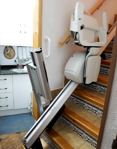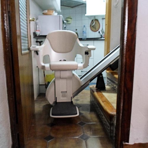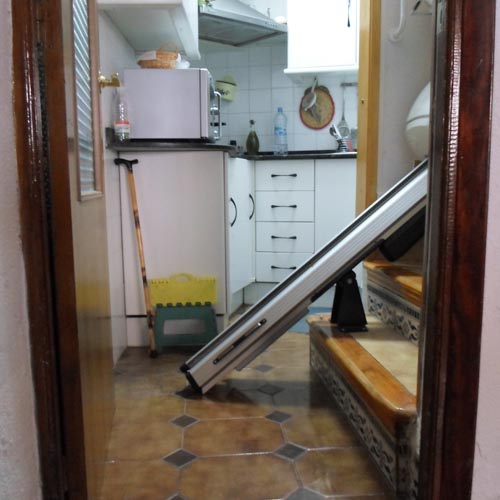 Con un pequeño inconveniente que le hemos solucionado. La zona de aparcamiento inferior no había el suficiente espacio para que usuario pueda subir y bajar de la silla de forma segura, por eso le hemos puesto una silla con guía abatible, es decir, que el último tramo de la guía se desplaza plegándose o desplegándose para tener una mínima intrusión sobre la entrada a la cocina.
